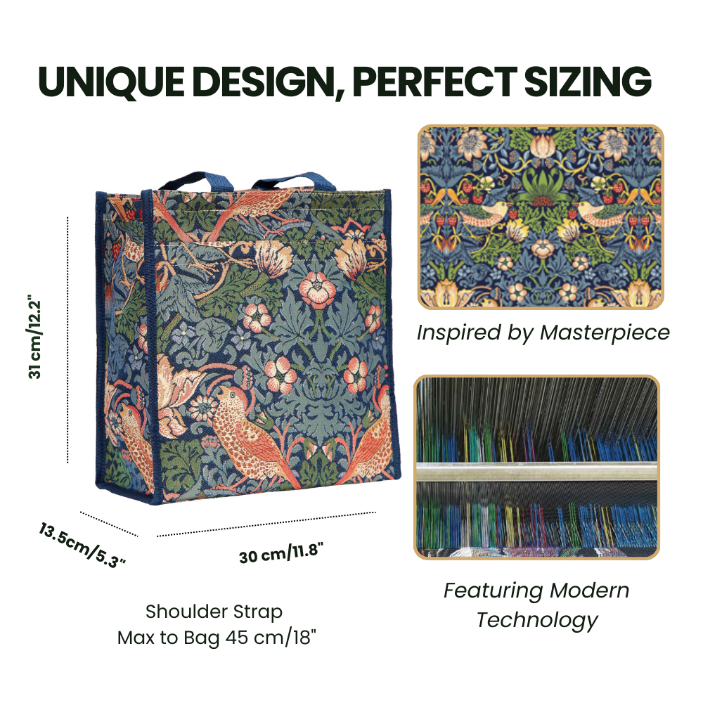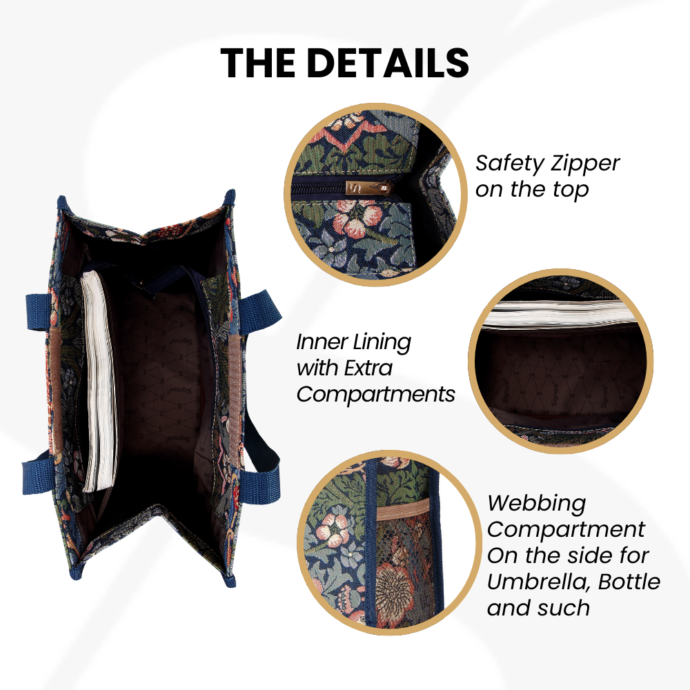 - Top of the bag is gusseted with the tapestry material and has zip fastening across the full width