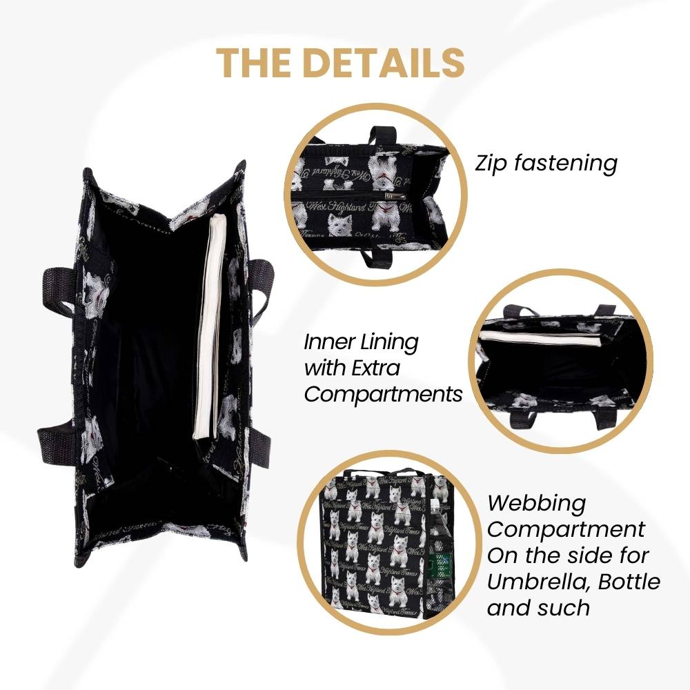 - Top of the bag is gusseted with the tapestry material and has zip fastening across the full width
